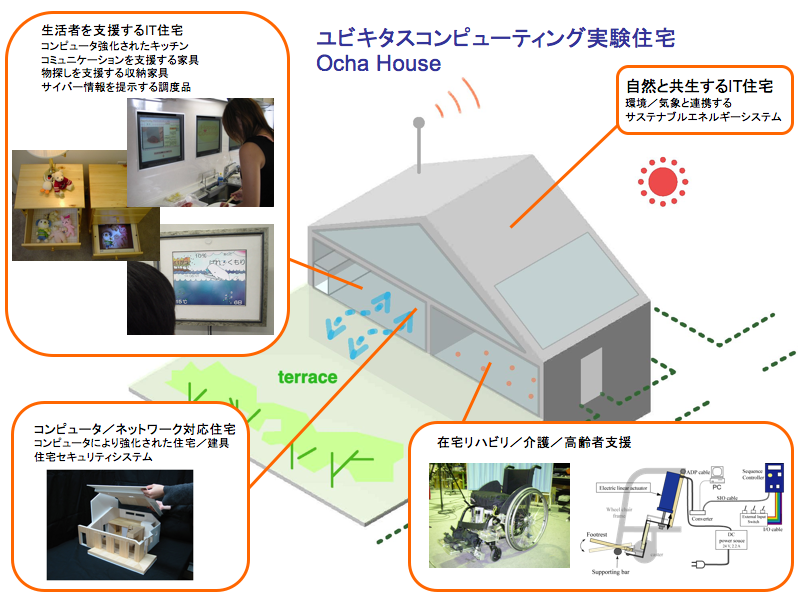 Ocha House (お茶の水女子大学ユビキタスコンピューティング実験住宅) は,ユビキタスコンピューティングのアプリケーションを 実証するための実験住宅です. お茶の水女子大学小石川地区に,2009年3月18日に完成しました.