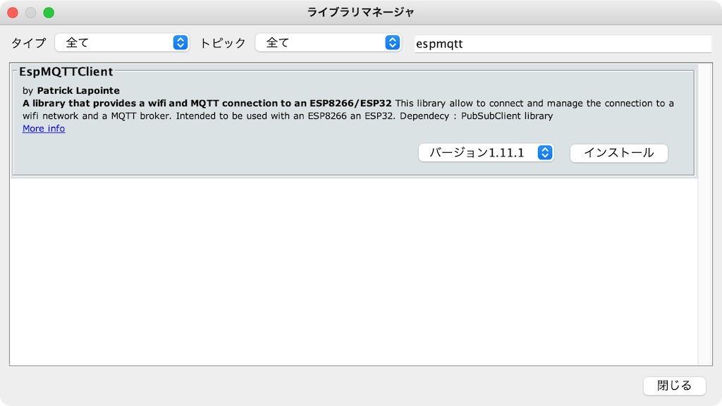 「ツール」「ライブラリを管理」を選び、espmqttで検索すると、EspMQTTClientというライブラリが見つかります。 こちら、
