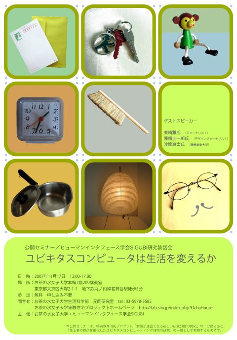 Open House + Demonstration 15:30 ~ 17:00 13:00-13:20 挨拶+本研究の概要(お茶の水女子大学准教授 元岡展久) 13:20-14:00 藤崎圭一郎氏講演(デザイン・ジャーナリスト) 「幸せな住まいとは? コモンのある生活空間」 14:00-14:40 渡邊恵太氏講演(慶応義塾大学) 「空間から時間へ。コンピュータの時間的浸透にむけて」 14:40-15:00 休憩 15:00-15:40 美崎薫氏講演(ジャーナリスト) 「コンピュータのある生活、コンピュータの中の生活」 15:40-16:20 質問,および討論会(司会:お茶の水女子大学教授 椎尾一郎) 16:20-16:30 まとめ(お茶の水女子大学准教授 太田裕治)
