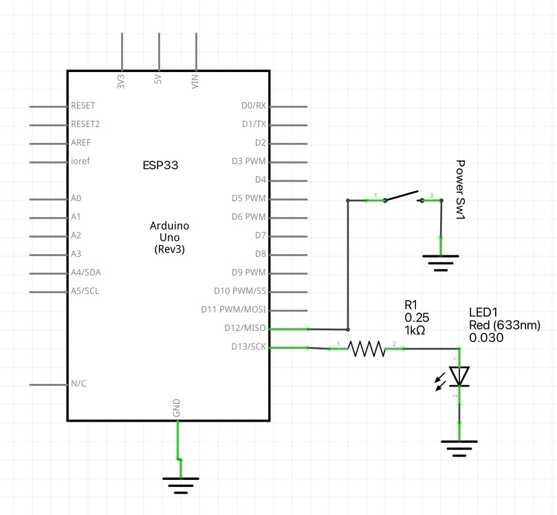 以下のようにスイッチとLEDを付けて、MQTTブローカに接続するプログラムを書きました。