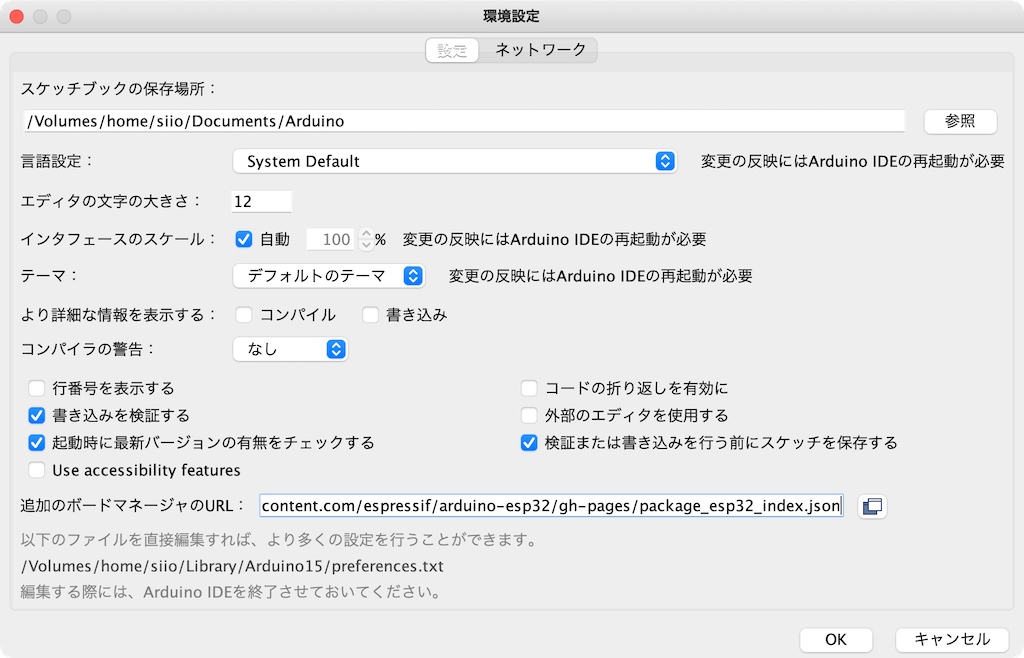 という文字列を、Arduino IDEのPreferencesの「追加のボードマネージャのURL」の場所にコピペします。