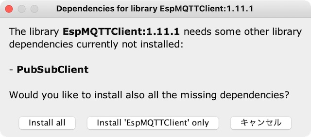 More Infobの部分をクリックすると、開発ページにジャンプします。そこに使用例などが説明されています。 また、元になるPubSubClientがまだインストールされていない場合は、インストールするように指示されます。Install allを選んでおきます。