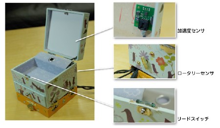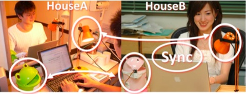 - 離れた家の家族が同じ行動をすると,システムが音などでしらせます.行動の偶然の一致が、話題のきっかけ、親近感、連帯感などをもたらすことに着目した新しい遠距離コミュニケーションシステムです.