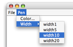 上記のようにメニューを作った場合、メニューが選択されると、自分自信のactionPerformedが呼び出されますので、この中でメニューを判定して太さを変えます。
